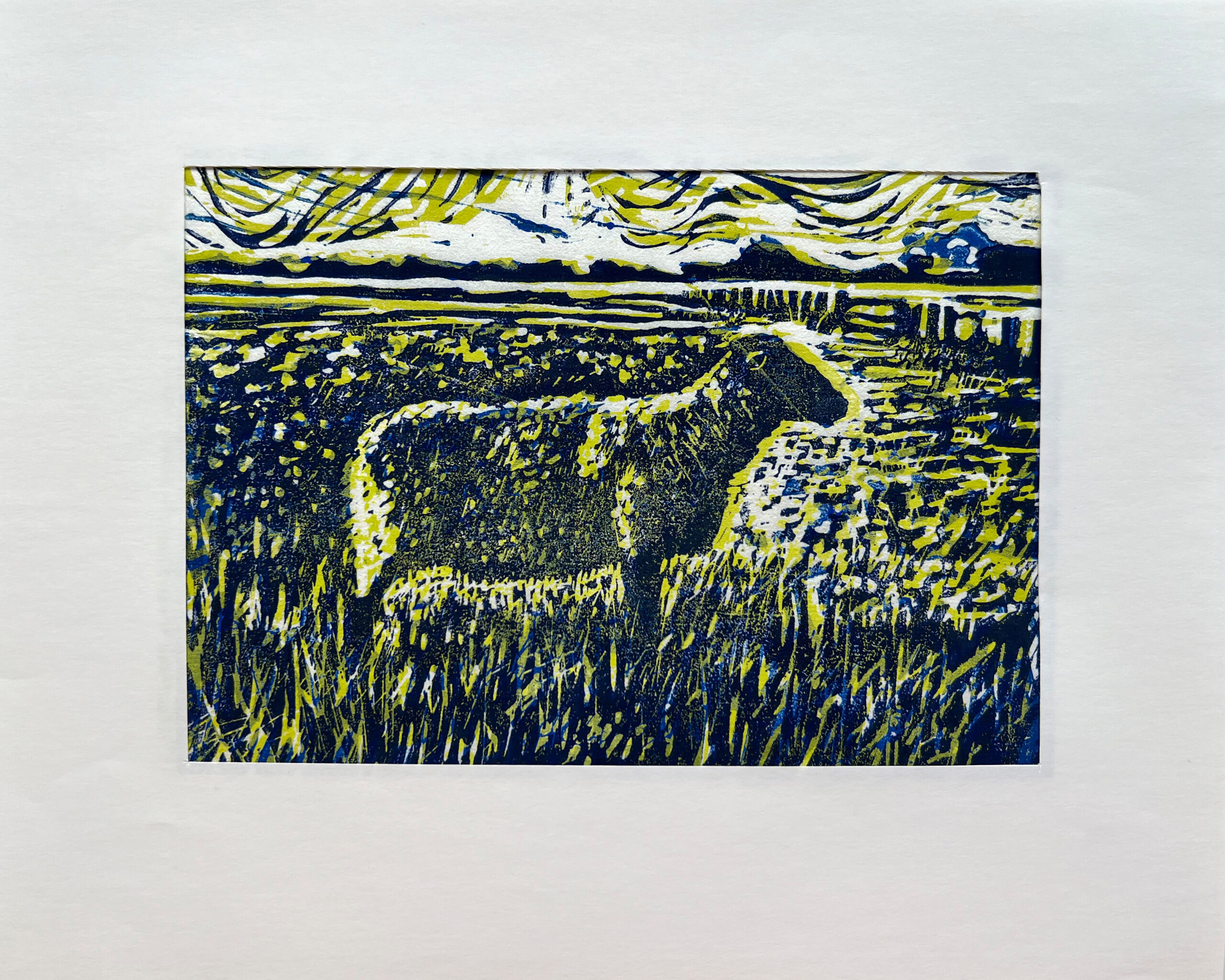 mehrfarbiger Linol-Holzschnitt, Unikatdruck, Motiv: 15×20 cm, Passepartout: 24×30 cm, 2024