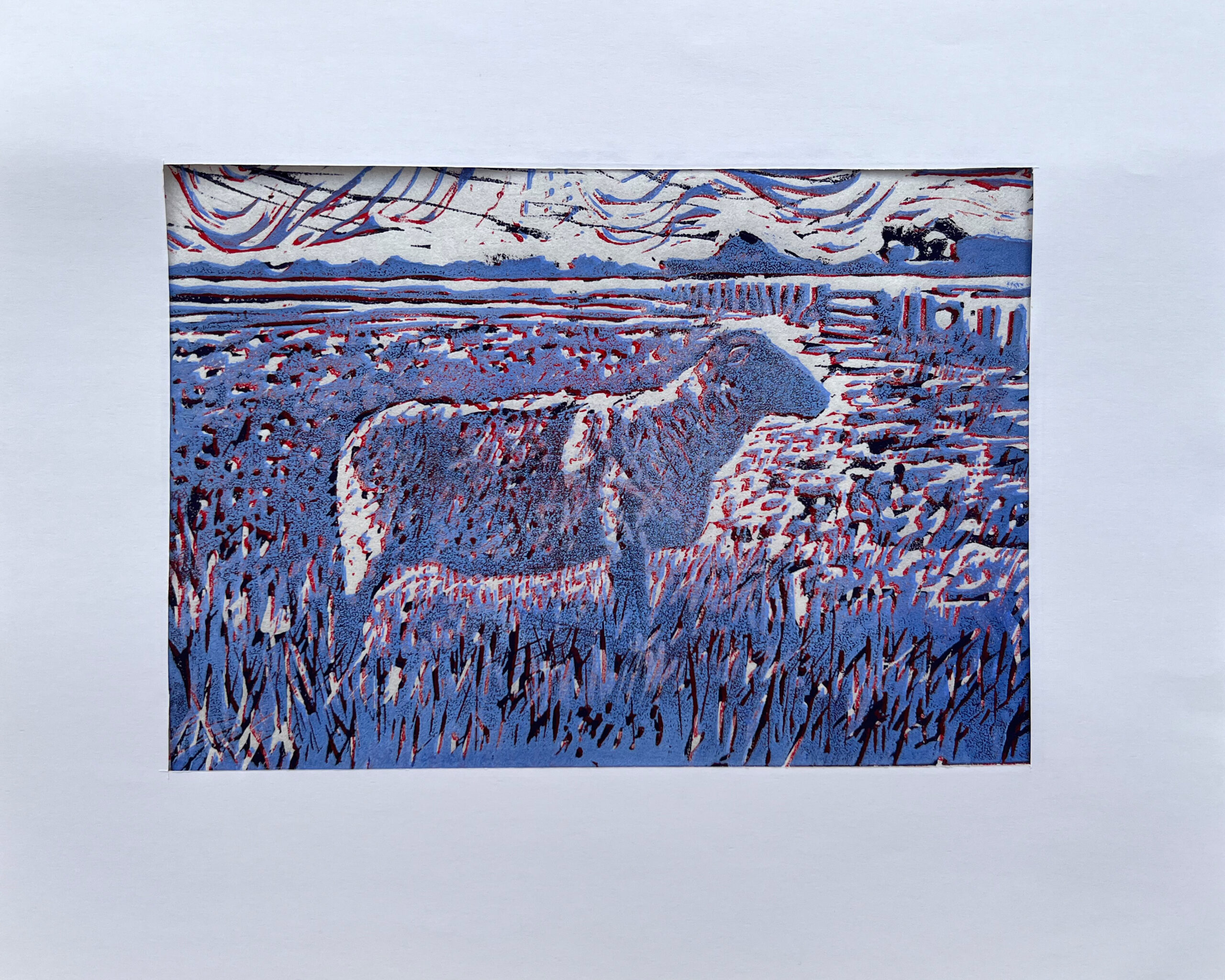 mehrfarbiger Linol-Holzschnitt, Unikatdruck, Motiv: 15×20 cm, Passepartout: 24×30 cm, 2024